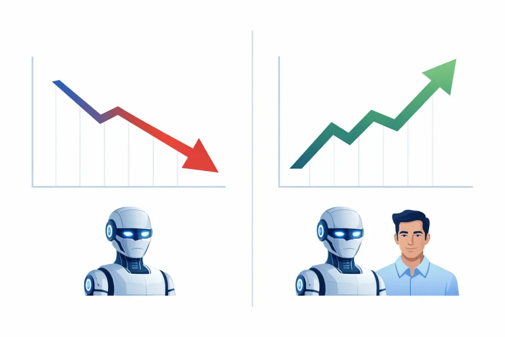 Pure AI content – published without substantial human editing – underperforms for specific, well-documented reasons.