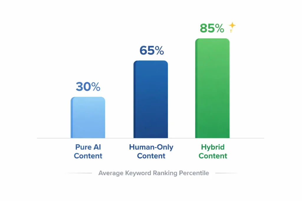 The key takeaway from the data: Hybrid content is not marginally better – it is substantially better. The gap between pure AI content and hybrid content is nearly 60 percentile points in average keyword ranking.