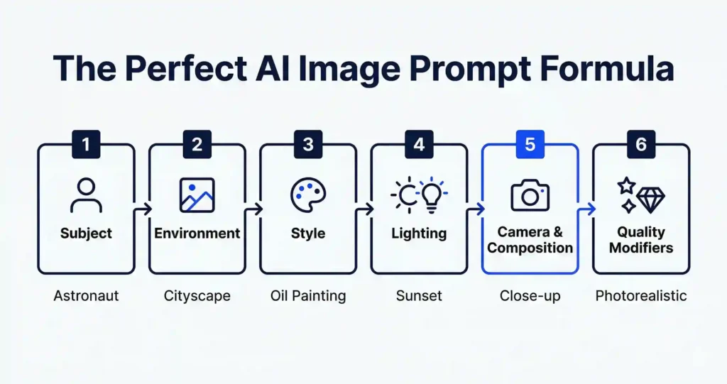 Element 5 : Camera and Composition How is the image framed? “Wide angle showing the full environment,” “close-up portrait with blurred background,” “top-down flat lay view,” “eye-level perspective” – these instructions tell the AI how to position the virtual camera, which controls how professional the final composition feels.