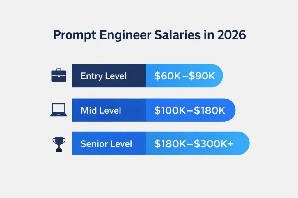 In the United States, prompt engineer salaries in 2026 range from $60,000 per year at entry level to over $300,000 for senior roles at top AI companies. The mid-level range of $100,000 to $180,000 represents the most common compensation band for professionals with two to five years of experience. Salaries vary significantly by company type, location, and whether the role is technical or content-focused.