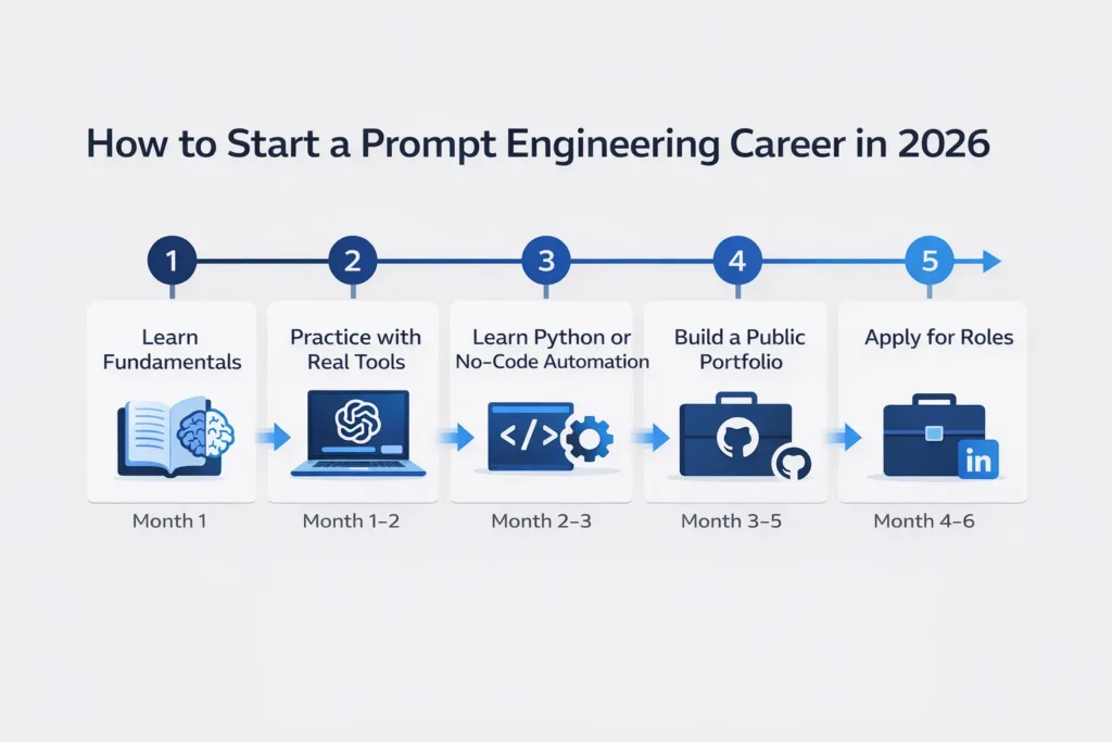 Most people can develop foundational prompt engineering skills in two to three months of focused practice. Building a portfolio strong enough to land a first role typically takes four to six months. Moving into mid-level positions with competitive salaries generally requires one to two years of documented experience with real projects and measurable outcomes.